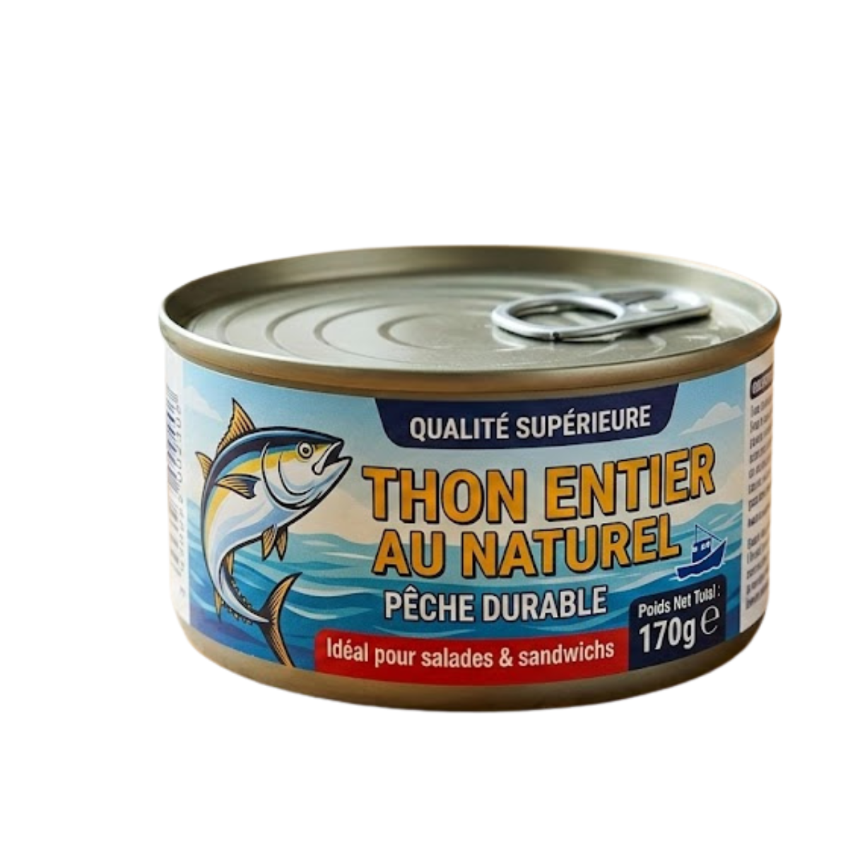 Ce produit est une conserve de thon au format 170g, destinée aux consommateurs recherchant un ingrédient de base qualitatif pour leurs repas quotidiens ou leurs réserves alimentaires.